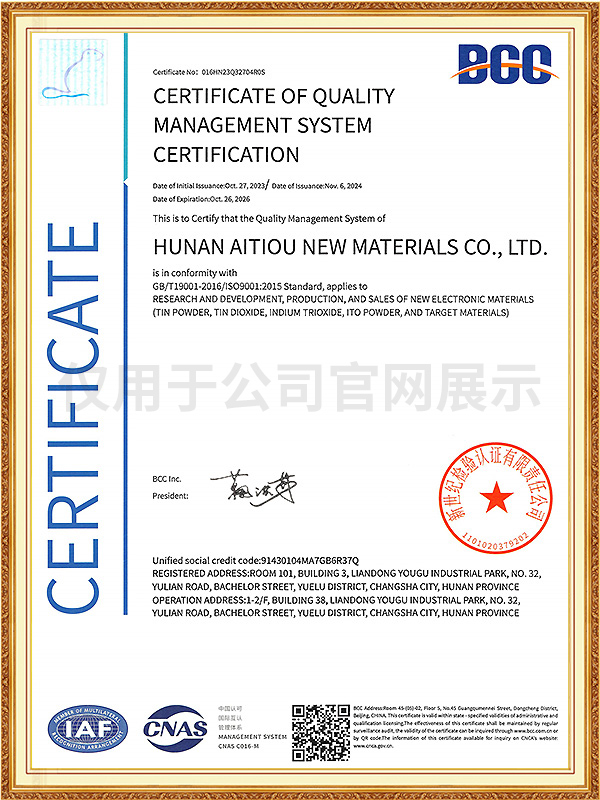 服务优势 —————————————— 公司可为客户提供定制化产品解决方案,精准匹配靶材、电极、玻璃、陶瓷、能源等领域的多样化需求。 公司已通过ISO9001质量管理体系、ISO14001环境管理体系及ISO45001职业健康安全管理体系认证。