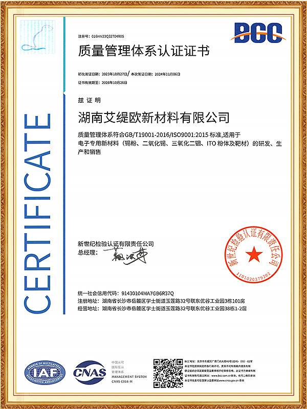 近日,湖南艾缇欧新材料有限公司顺利通过了ISO9001质量管理体系、ISO14001环境管理体系和ISO45001职业健康安全管理体系(以下简称“三体系”)认证审核,并取得了认证证书。三体系认证顺利通过,印证了艾缇欧具备为客户提供锡粉和二氧化锡产品和服务的能力,具备防控环境污染的能力,具备保障员工职业健康安全的能力,标志着公司在标准化、程序化、规范化之路上迈出了坚实的一步,也意味着公司综合管理水平和市场竞争力跨上了新台阶。